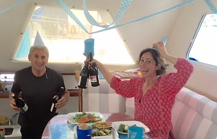 Phase 2…birthday brekkie. Then onto some more serious duties such as provisioning the boat (again…) But wait, Phase 3 begins and we’re back to “Trace Day”… coffee, candles and free birthday cake…..(how she conned the cafe manager into that at 10am is beyond me and we hadn’t even finished provisioning yet!)